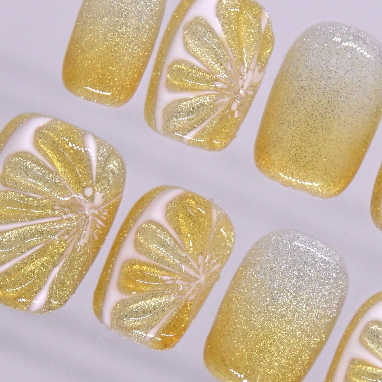 This set blends glowing yellow ombré, fine silver sparkle, and hand-painted fruit-slice details into something fresh, playful, and dreamy. The white lines keep the design airy and delicate, while the glitter finish gives it that sunlit glow that feels sweet without trying too hard.
