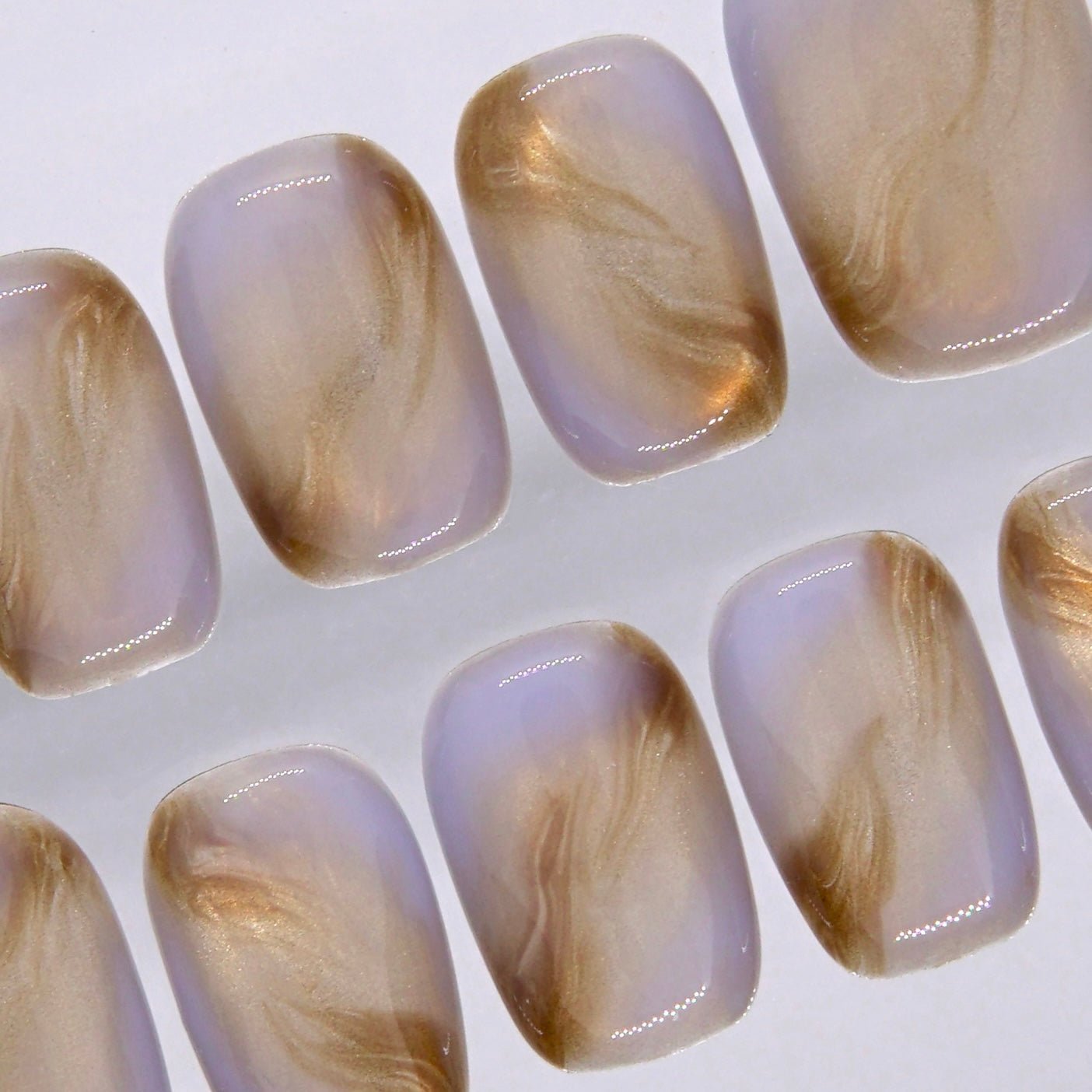 is a set that feels effortless in the most beautiful way. The creamy translucent base is layered with flowing golden brown swirls, creating a soft marbled finish that feels warm, airy, and quietly refined.