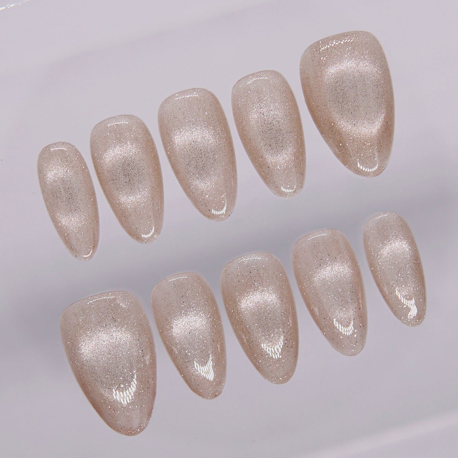 Champagne gold cat eye press-on nails displayed in full set – First Light by Art By Cloe