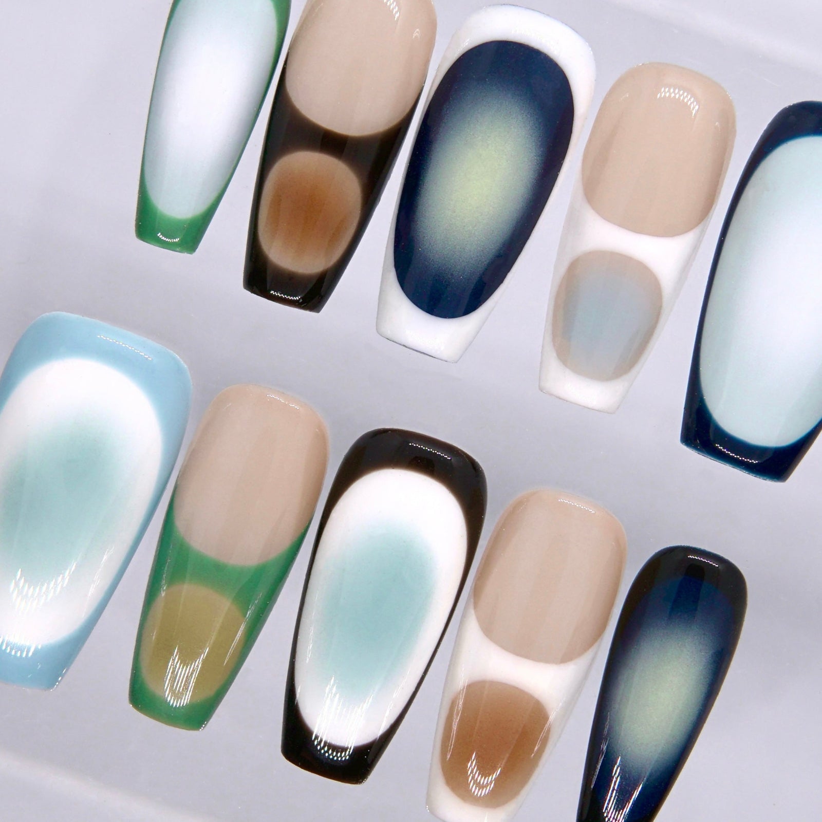 This set plays with negative space, blurred centers, and bold framing in a way that feels artistic without becoming heavy. Each nail feels intentionally placed, like a tiny abstract study in shape and balance. The result is cool-toned, minimal, and striking in a very controlled way.