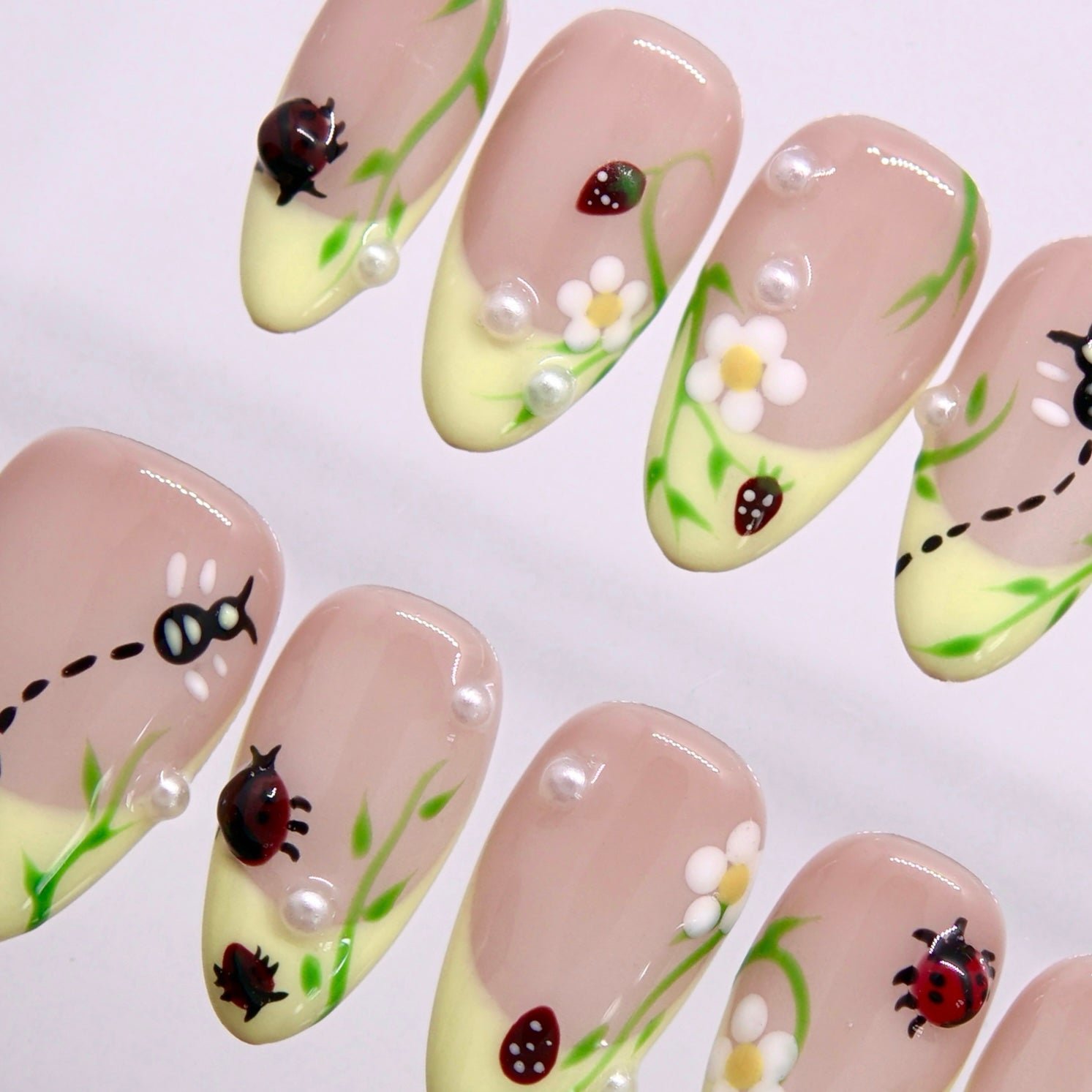 Little Things Bloom features a sheer nude base blended with a soft pastel yellow tip, decorated with hand-painted ladybugs, ants, tiny strawberries, leaves, and blooming flowers.