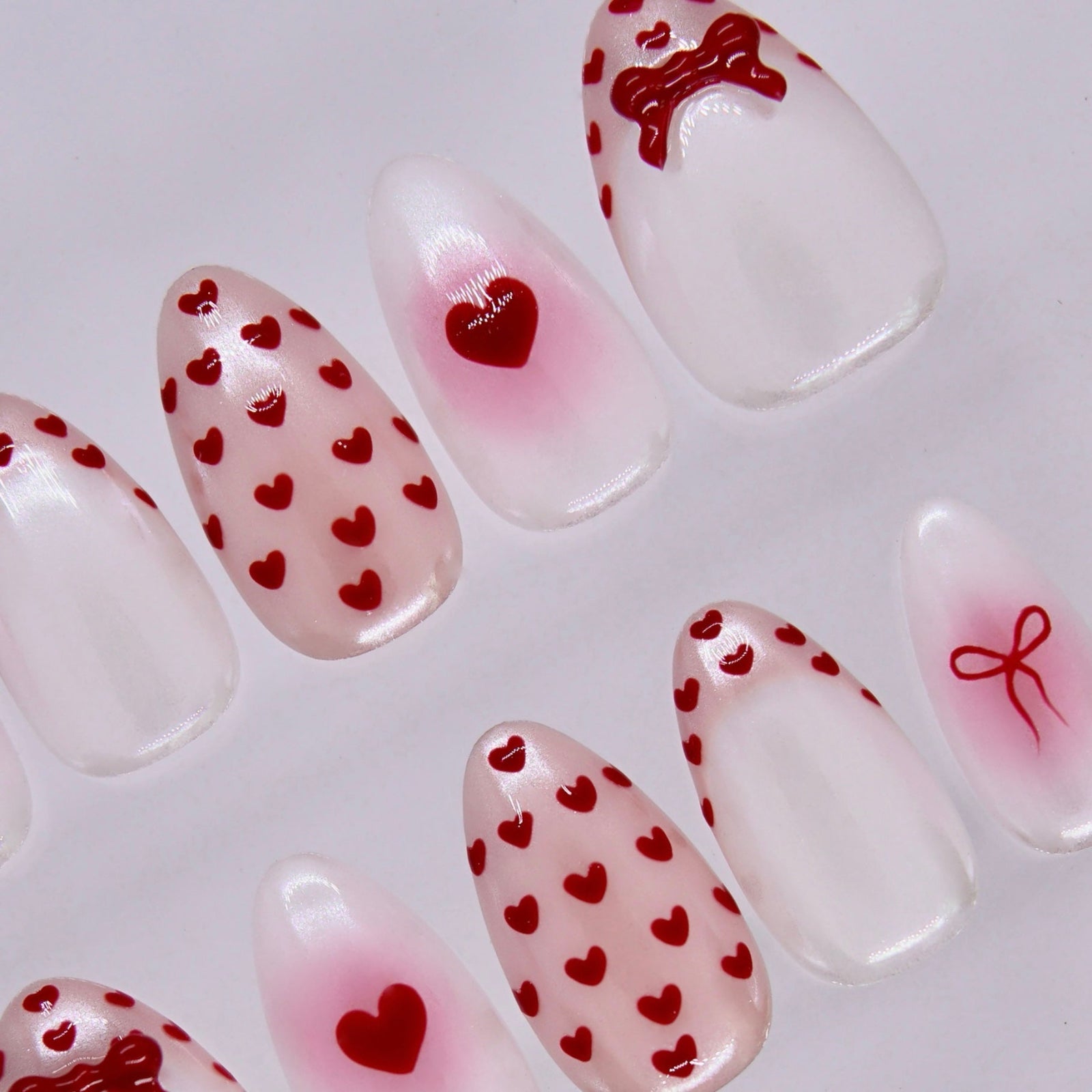 Soft milky base with red heart and bow details for a gentle Valentine mood